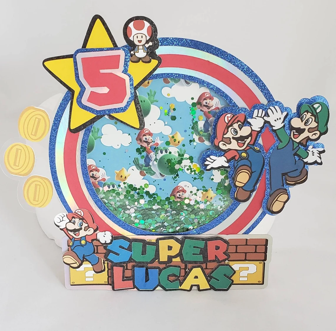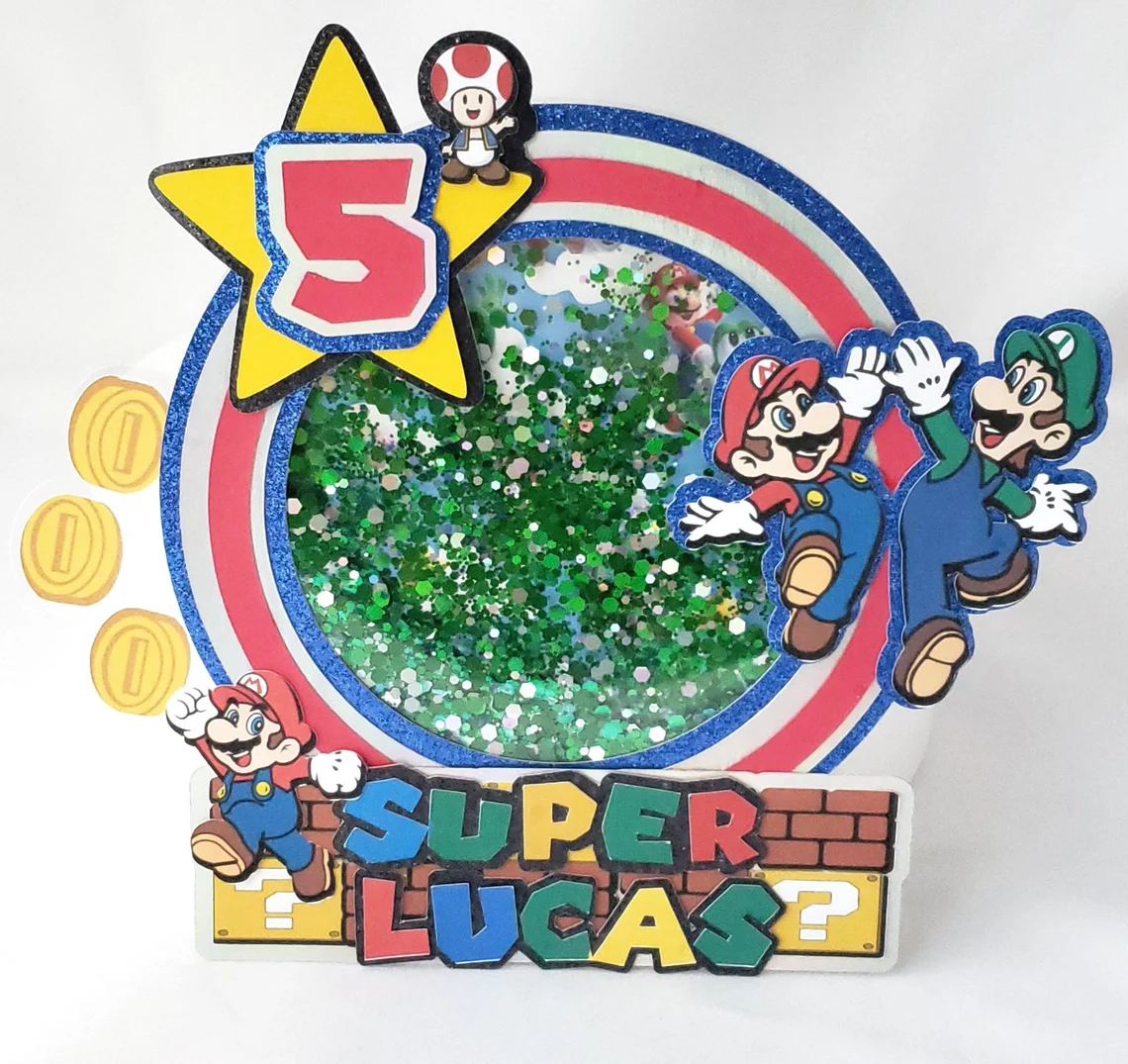 Celebrate your child’s birthday with a Mario Brothers cake topper. This topper can be customized by name and age. Please order in advance to ensure it meets the delivery time. Confirmation and tracking will be sent.